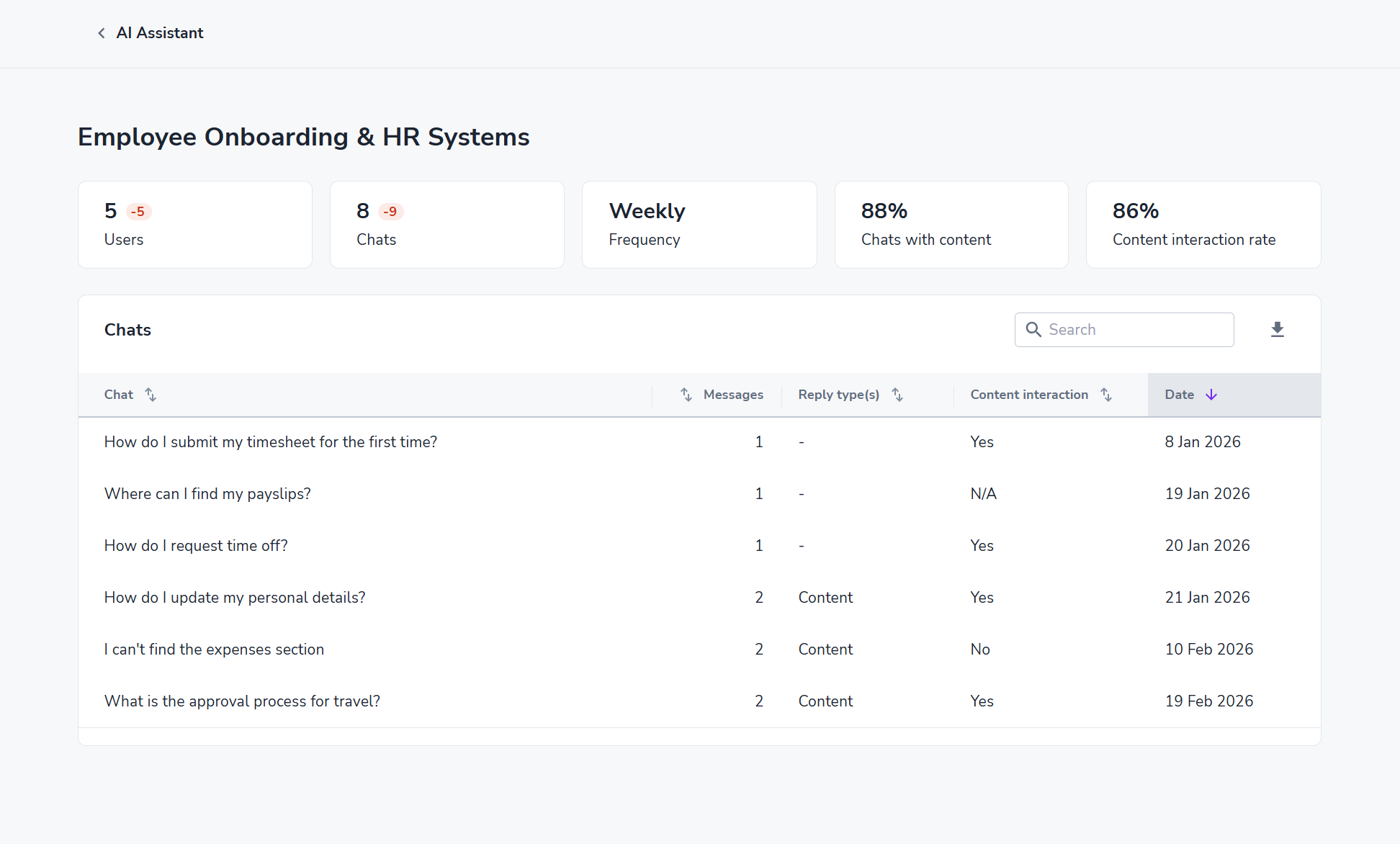 See at a glance whether the AI Assistant responded to user questions with or without relevant content. This metric helps you: