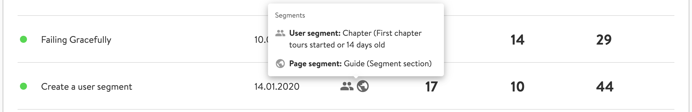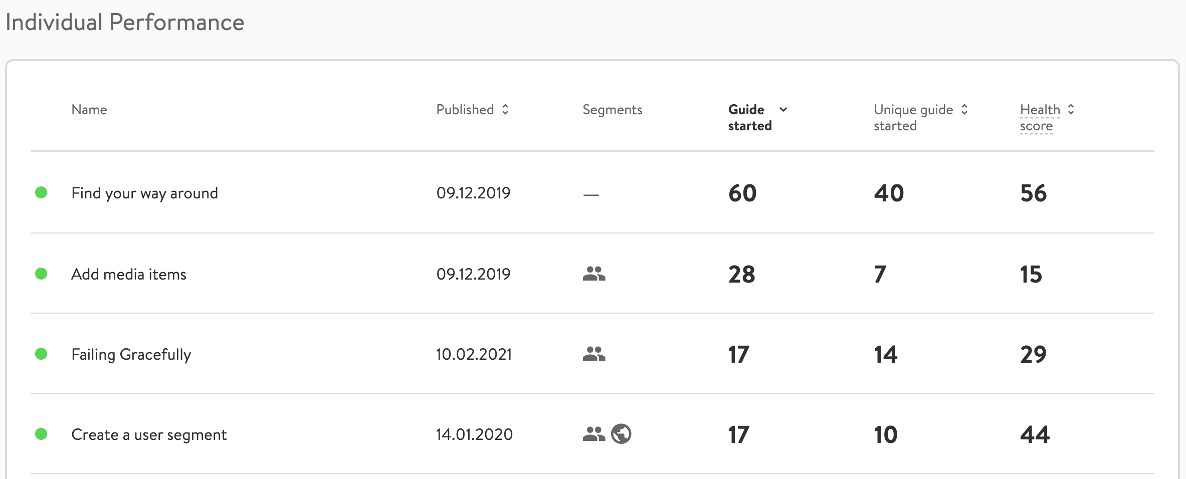 Each Guide has a calculated Health Score. The Health Score indicates how far your users progressed through a Guide.