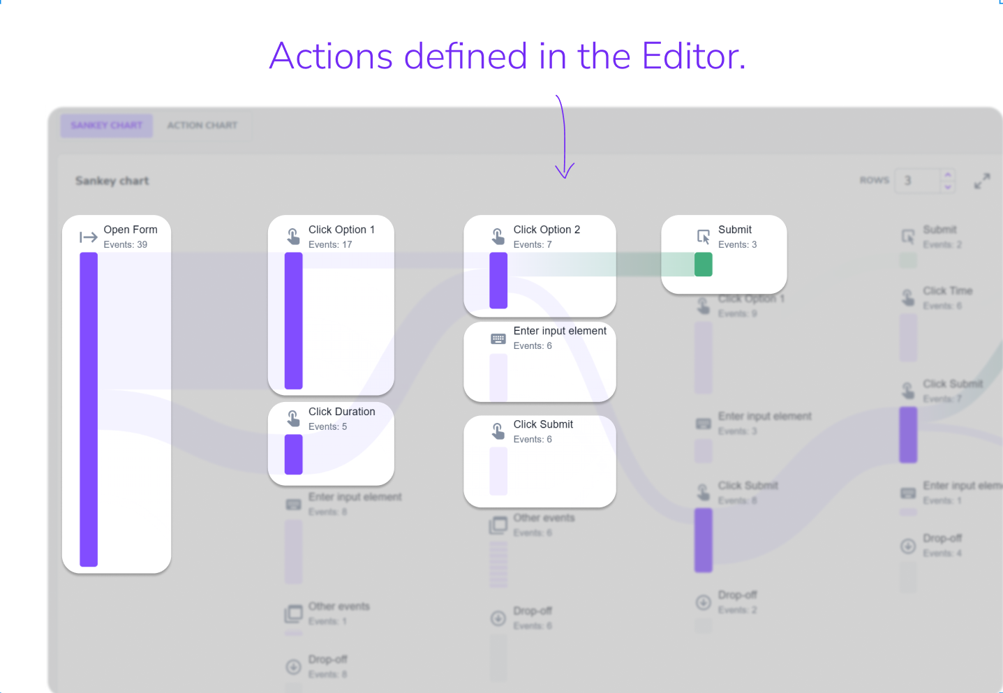 - Nodes (bars): Each node represents an action defined in your Task. The height of a node is proportional to the number of events recorded for that action. Event counts are shown on hover for each node and flow.