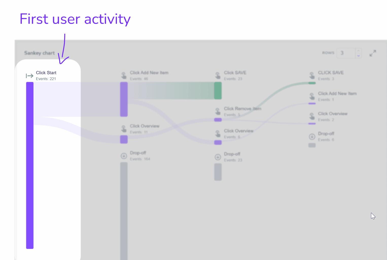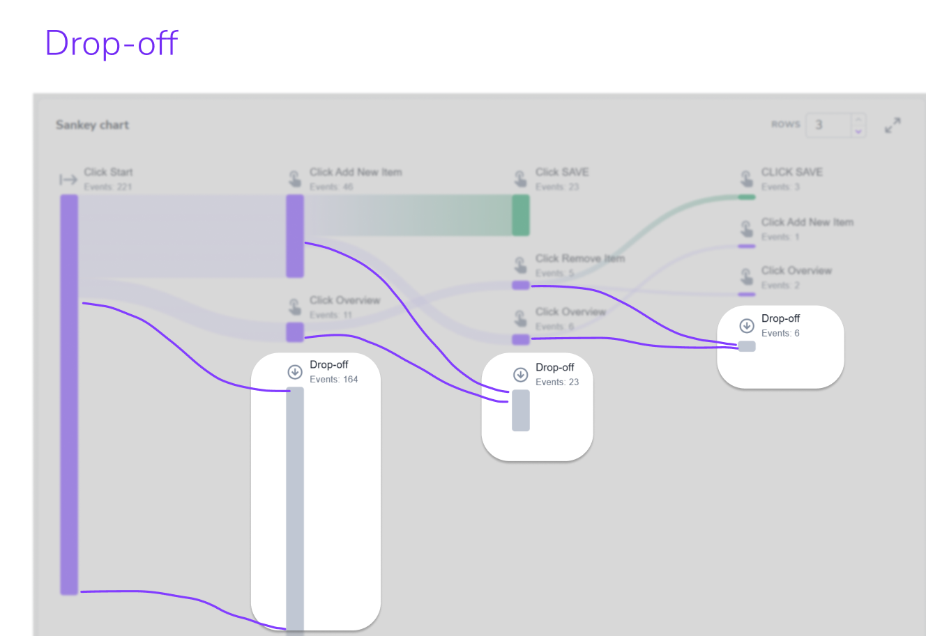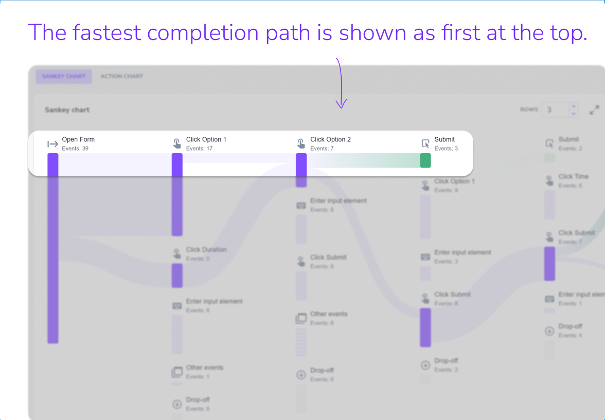 By default, the diagram shows the 3 most common paths. Less common paths are grouped under "Other events." Increase the number of rows to reveal more detail.