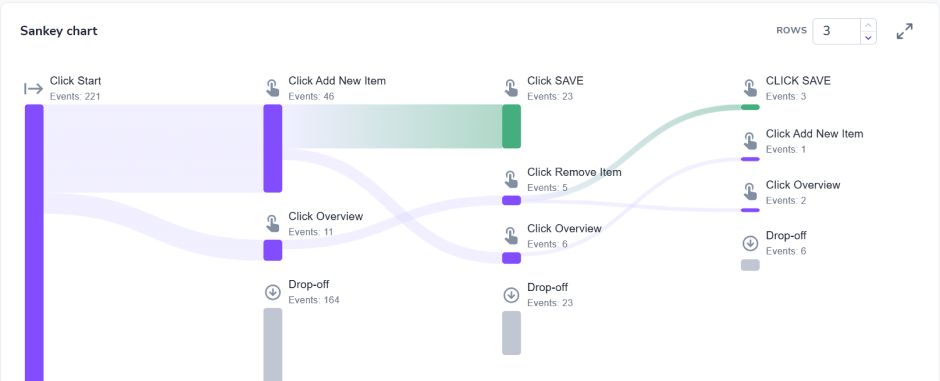 Task can be defined with multiple starting points in the Editor. If your Task has multiple starting points, the Sankey shows which one users triggered most often, helping you understand where users actually begin the workflow.