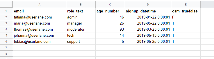 - The email column is the identifier and must have the header "email." Email addresses need to be entered in all lowercase letters.