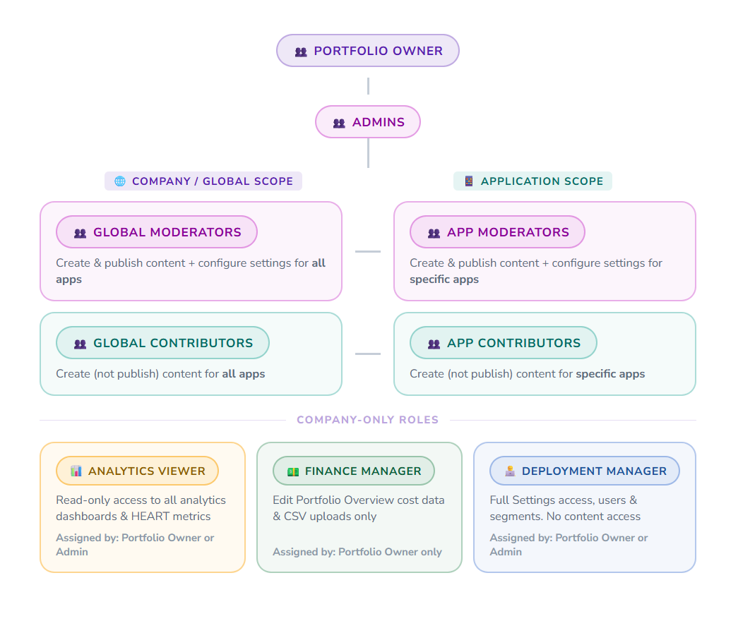 | Moderator | Create, publish, and configure content. Company-wide or app-specific scope. | Admin | Company or App | |||